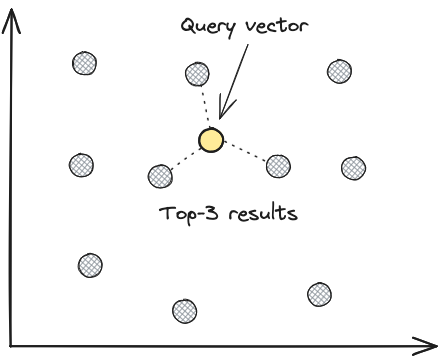 The simplest way to perform vector search is to perform a brute force search, without an index, where the distance between the query vector and all the vectors in the database are computed, with the top-k closest vectors returned. This is equivalent to a k-nearest neighbours (kNN) search in vector space. Choose brute force search when you need guaranteed 100% recall, typically with smaller datasets where query speed isn’t the primary concern. The system scans every vector in the table and calculates precise distances to find the exact nearest neighbors.